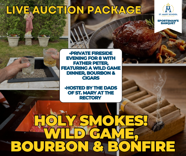 Gather your favorite crew for an unforgettable private wild game dinner for eight at Fr. Peter’s rectory. Hosted by the Dads of St. Mary, this one-of-a-kind evening features expertly prepared wild game, bourbon poured just right, premium cigars, and a relaxed finish around the fire pit.